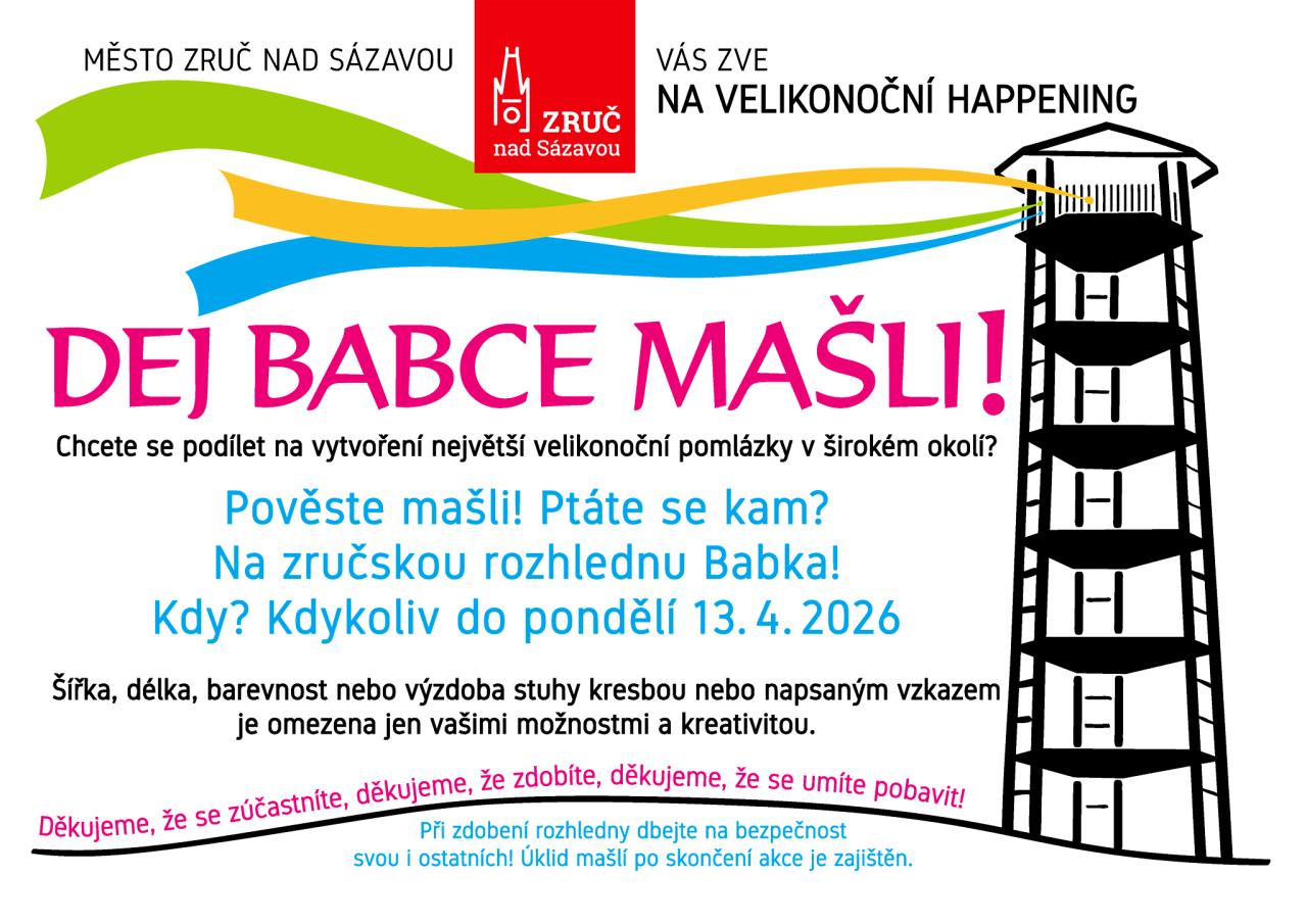 Město Zruč nad Sázavou vás zve na velikonoční happening. Pověste mašli na zručskou rozhlednu Babka a podílejte se opět na výzdobě největší velikonoční pomlázky v širokém okolí.
